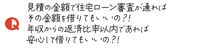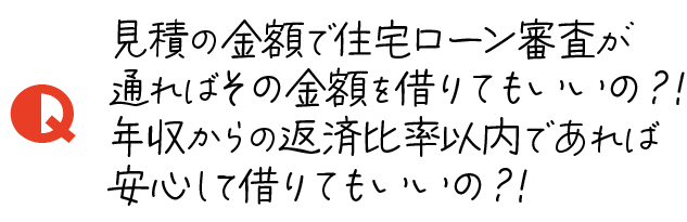 住宅ローンで、「借りることができる金額」と「借りてもいい金額」は異なります。住宅会社の営業マンや金融機関担当者からの「この金額までならローンを組めますよ」と言う金額で借りてしまうと後々支払いが苦しくなりローン破たんをしてしまう可能性だってあります。ご家庭によってライフスタイルは様々で、それぞれのご家庭の生活基準にあった資金計画が大切です。家は家族が幸せに暮らしていくための言わば道具。家は購入できたけど支払が苦しく外食や家族旅行にも行けないのは本末転倒。適正価格診断をして「毎月この金額なら今後30年・35年支払っていくことができる予算」を知っておきましょう。反対にしっかりと計画していくことで「なんとなく不安」を解消し予算をUPできる可能性もあります。
